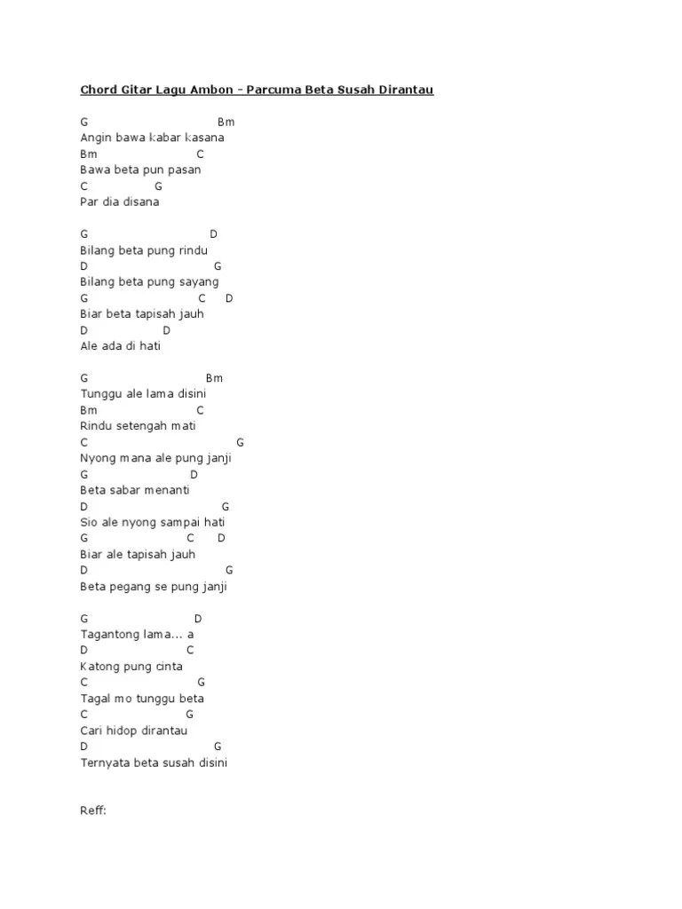 Bawa beta pung pasanpar dia disana. C g par dia disana. Lirik dan chord kunci gitar ambon paling gampang. Kumpulan lirik dan kunci gitar atau chord lagu ambon terkenal seperti ✓ sio mama, ✓ angin bawa. G d bilang beta pung rindu